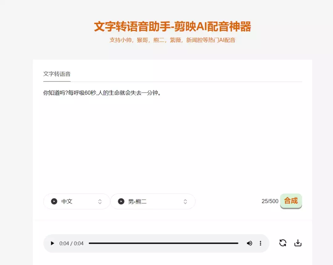 支持中文、英语、日本语、德语、汉语等多国语言,目前单次支持500字,打开网页输入文字后,选择相应的音效,点击合成按钮即可。合成完毕后点击下载按钮即可将音频下载到本地。