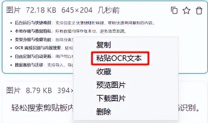 - OCR 功能:右键点击图片,选择“粘贴OCR文本”,即可快速获取粘贴文本内容(此功能实际测试OCR识别效果不是很好)。