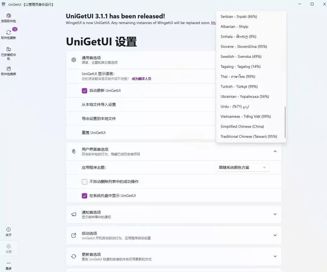 UniGetUI 安装完成后如果默认是英文语言,可以点击左下角的“Settings”,右侧选择“General preferences”。在“WigetUI display language”选项中选择“Simplified Chinese (China)”,然后重新启动 UniGetUI 即可更改为简体中文。