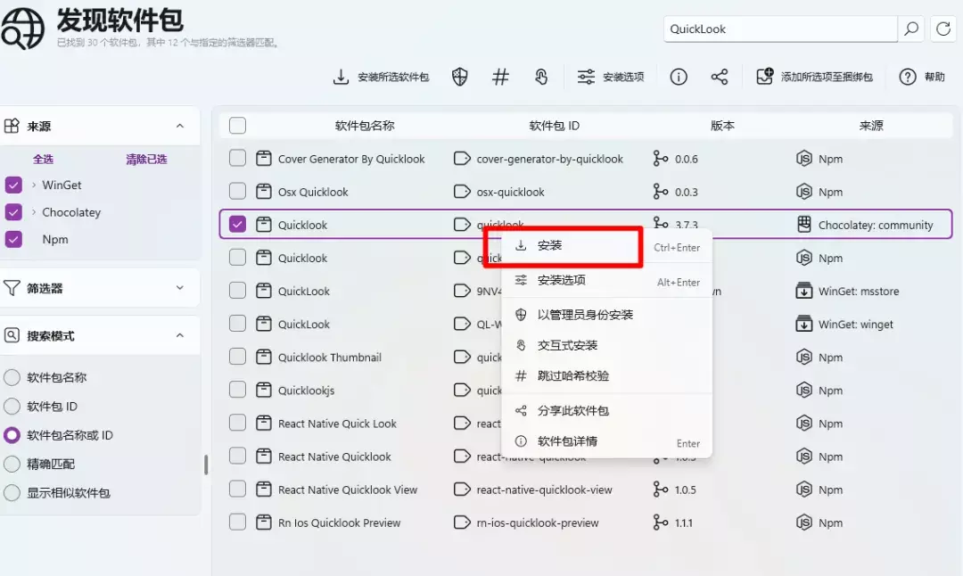 搜索软件包也很强大,只要知道开源软件的名称,比如搜索“QuickLook”,输入完成后,下面会自动列出所有可用的安装包,选择安装就可以了。
