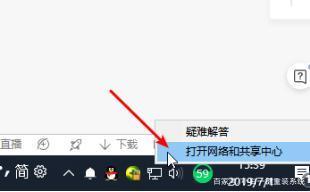 1、右键单击右下角的网络图标,选择“打开网络和共享中心”,如下所示: