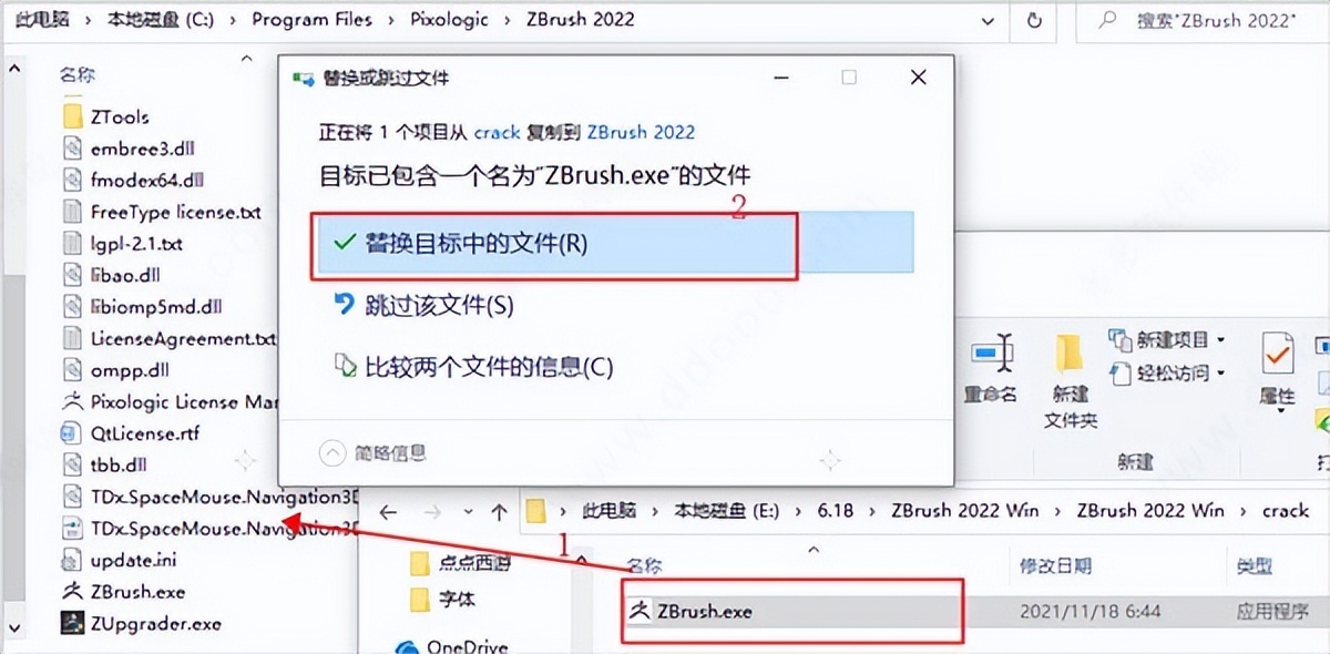 8、将从本站下载的crack文件夹中的“ZBrush.exe”复制到软件根目录下,并进行替换;