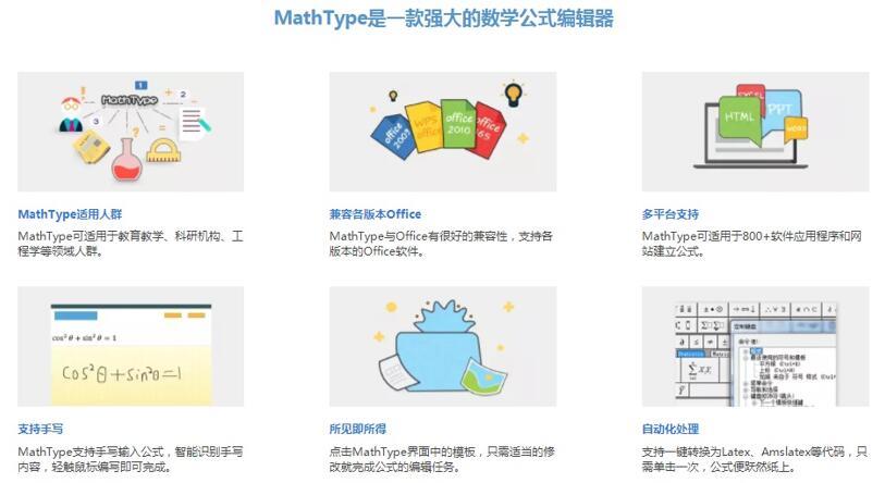 MathType数学公式编辑器支持在任何文字处理软件、演示程序、页面程序、HTML编辑工具及其它类型的软件,用来建立公式