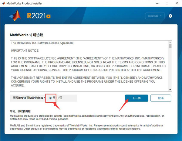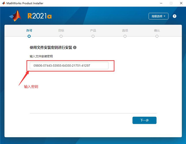ps.如果需要使用MATLAB服务器用户可以输入文件安装秘钥“40236-45817-26714-51426-39281”,点击下一步