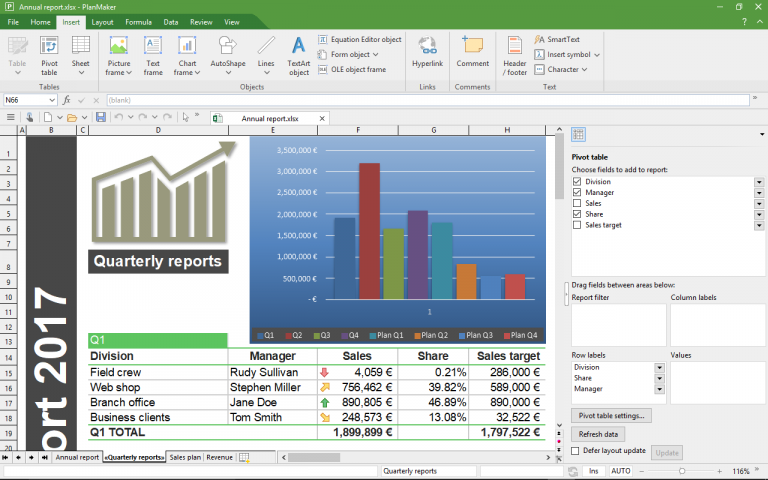 功能强大的电子表格程序PlanMaker可以创建任何复杂的计算,工作表和图表:从简单的时间表到公司的完整财务规划。由于它本身使用XLSX文件格式,因此您可以将Microsoft Excel文件编辑为原始版本。
