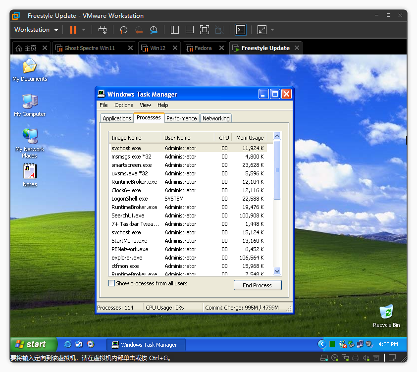 进入桌面可以看到经典的 WinXP 界面风格了,桌面图标、任务栏、壁纸基本上都复原了。