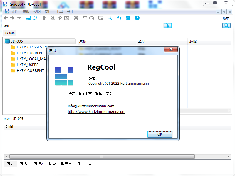 RegCool,免费注册表编辑管理工具,高级注册表编辑器,注册表快速跳转工具。具有注册表快照、比较注册表、整理注册表,搜索和替换、多个撤消和重做操作,查找和替换所需注册项/键值/字符串等功能;可以编辑注册表文件如同系统自带的注册表编辑器一样,并且提供注册表比较功能以及便捷的收藏夹跳转功能。