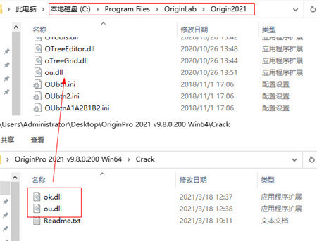 6、接着打开Crack夹将两个破解文件复制到软件安装目录中进行粘贴替换,默认安装目录为【C:\Program Files\OriginLab\Origin2021】