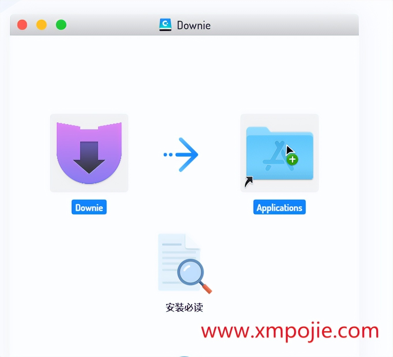 如图所示:拖动左侧图标到右侧蓝色文件夹中即可自动完成 Downie 破解安装。