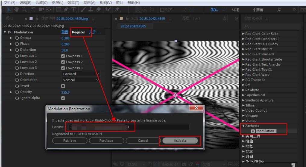 2. 打开AE,在顶部菜单,效果>Zaebects>Modulation,使用插件,效果控件面板点击Register, 输入序列号完成激活:ZBMD*GFX*Camp*298394516728034SUL9