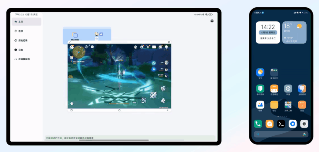 然后其它端输入被控手机端的网络调试配对码,链接成功后,点击设备的默认屏幕即可控制屏幕。如果不会的话,可以查看作者的视频教程,地址在文末哦。