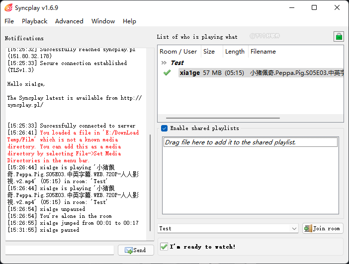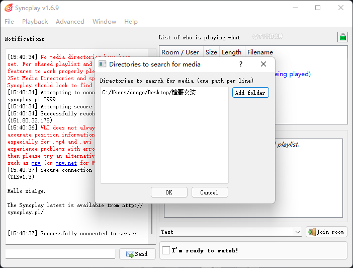 然后在「SyncPlay」界面可以看到 Room 播放列表就可以了。然后需要同步播放影片的电脑也重复上面一样的步骤。请注意,服务器、用户名、房间名一定要填写一样。