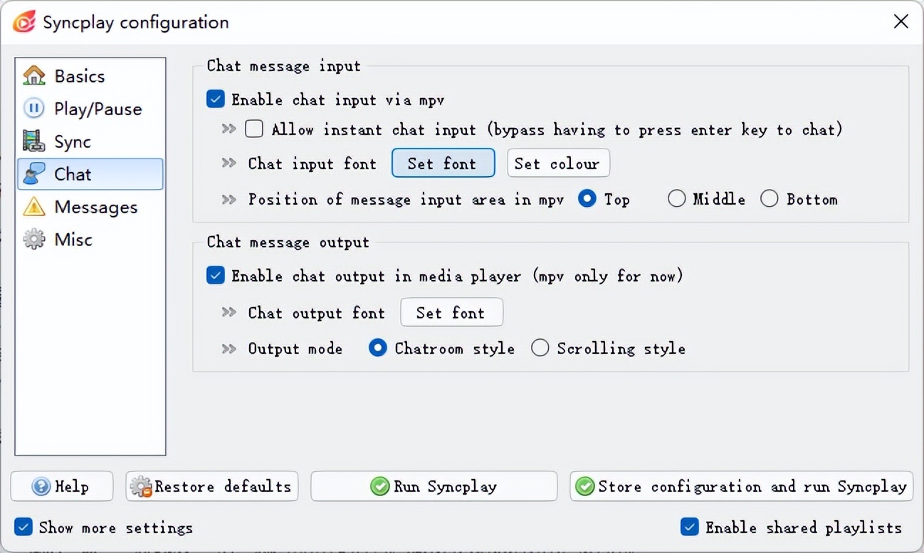 同步看电影想要语音聊天,可以用微信、QQ,或者其它语音软件都行,自己看着办。另外看电影过程中也可以文字聊天,更多功能细节设置,可以勾选左下角的 “Show more settings”,然后进入高级设置,选择 Chat,可以设置字体、颜色样式啥的。