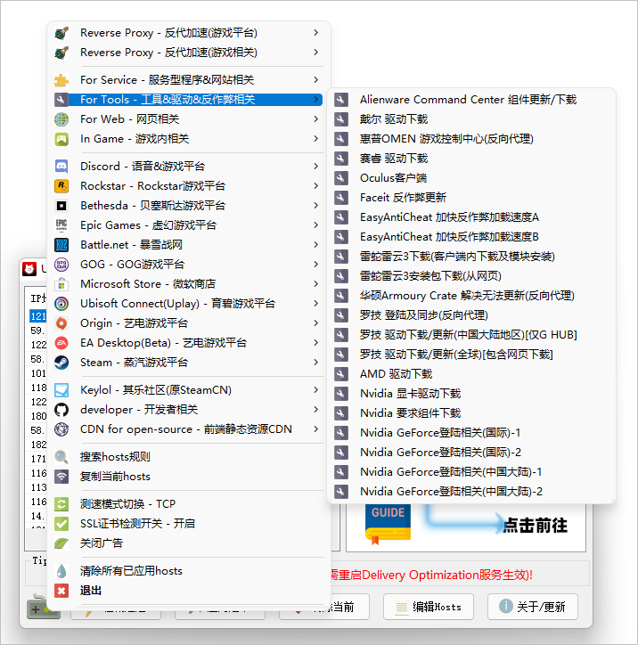 后来找到了 UsbEAm Hosts Editor 这款针对游戏的 Hosts 修改工具,主要是寻找游戏服务器全球可用 IP 地址,然后把速度比较快的 IP 地址绑定,这样就能提高下载速度了。