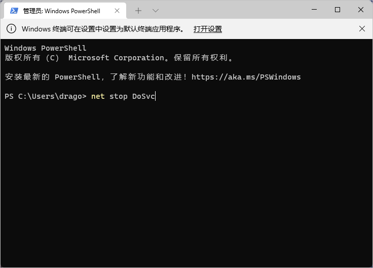 修改好后还需要重启 Delivery Optimization 服务才能生效,打开 PowerShell,依次输入下面的命令: