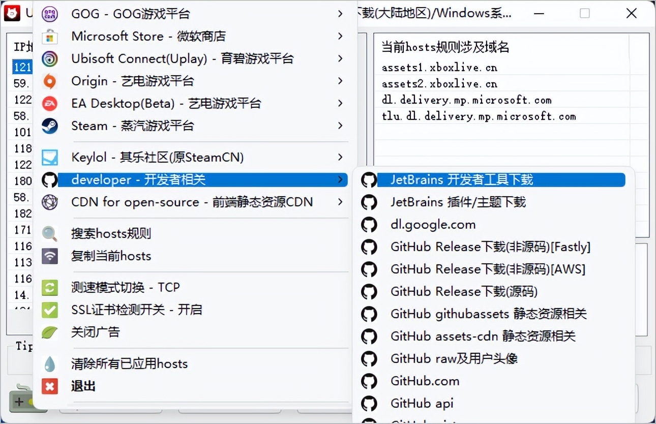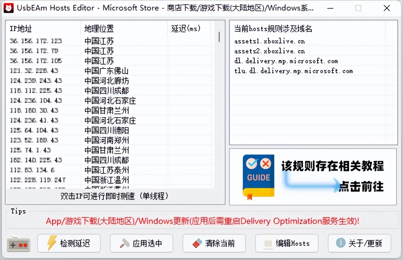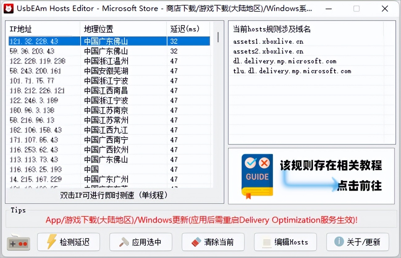 这里以微软商店为例,选择游戏下载后就会自动获取可用的 IP 地址,右边会出现相关的规则和域名。
