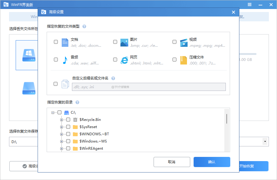 如果你还有更高级的自定义恢复需求,可以点击高级设定,选择你要恢复的文件类型,支持自定义文件格式、指定恢复的目录。
