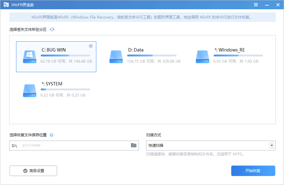 WinFR界面版完全调用了微软的 WinFR 命令行应用程序,并且界面很美观,使用起来很简单,小白新手也能轻松上手使用。