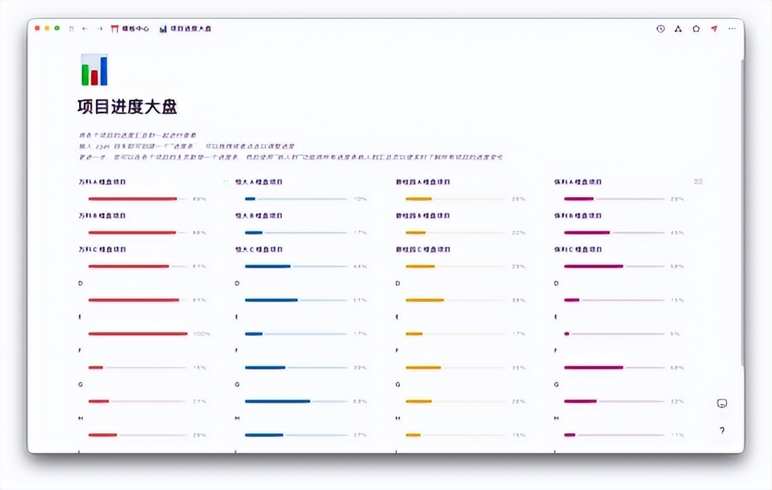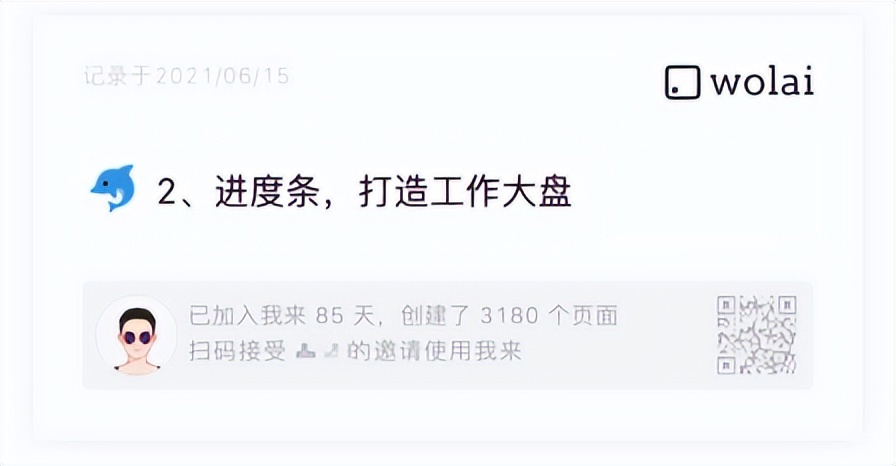 wolai的进度条可以手动/自动计算待办的进度,配合项目情况,搭建一个进度大盘。