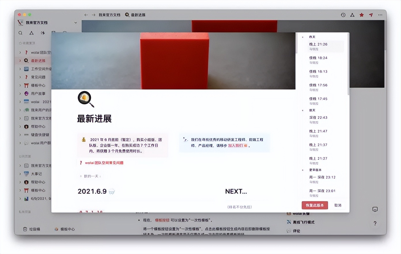 每一步操作都会被系统自动记录。页面有页面快照(当前页面可以恢复到任意历史版本),后续还会有块级历史,也就是说“块”也可以生成“块快照”,你的每一个页面上的每一个块都可以恢复到过去任何一个时刻的状态。那也就是说如果我们想要回滚一些版本的话,是可以非常方便的查看的。这就类似于他比较好地集成了 Git 版本控制工具,但这个功能得高级版才能支持。