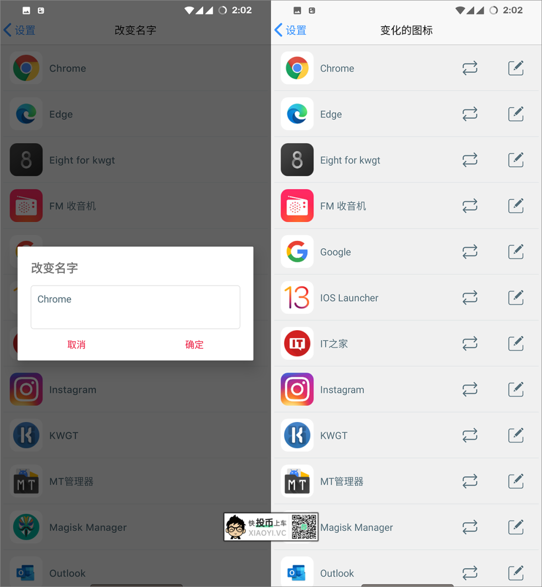 修改图标:为了更好的模仿 iOS,还支持自定义修改APP的图标,内置了一部分图标,你也可以自己下载图标然后替换,同时也支持修改APP的名称。