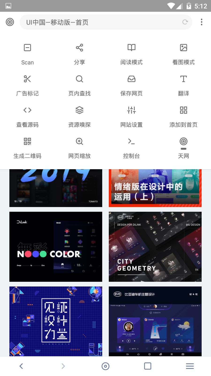 主要功能有:二维码扫描、分享、阅读模式、看图模式、广告标记、页内查找、保存网页、翻译、查看源码、资源嗅探、网站设置、生成二维码、控制台、天网……下面会挑选一些功能来给大家介绍。