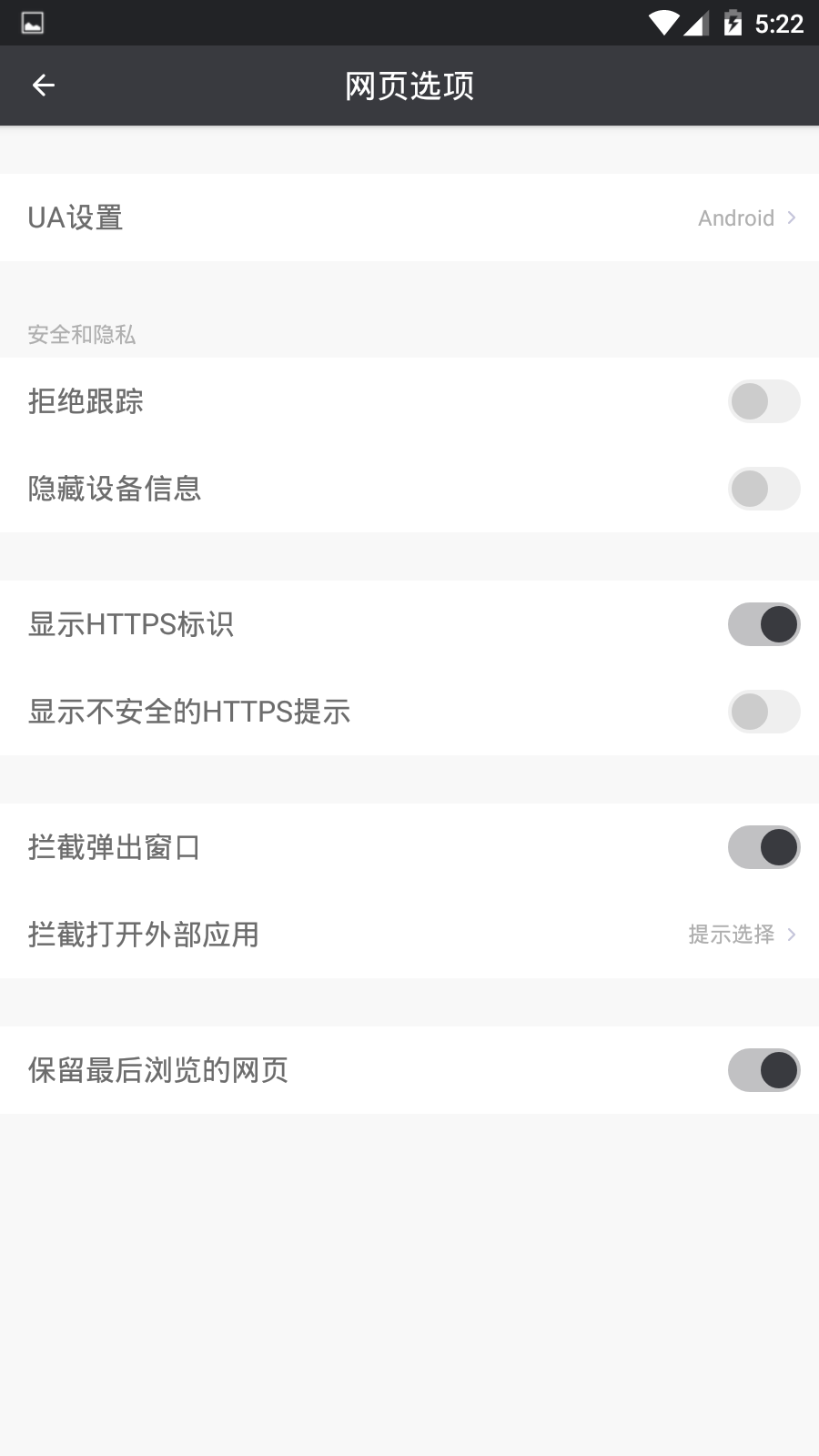 网页隐私安全设置:可以开启拒绝跟踪、隐藏设备信息、阻止弹窗等设置。