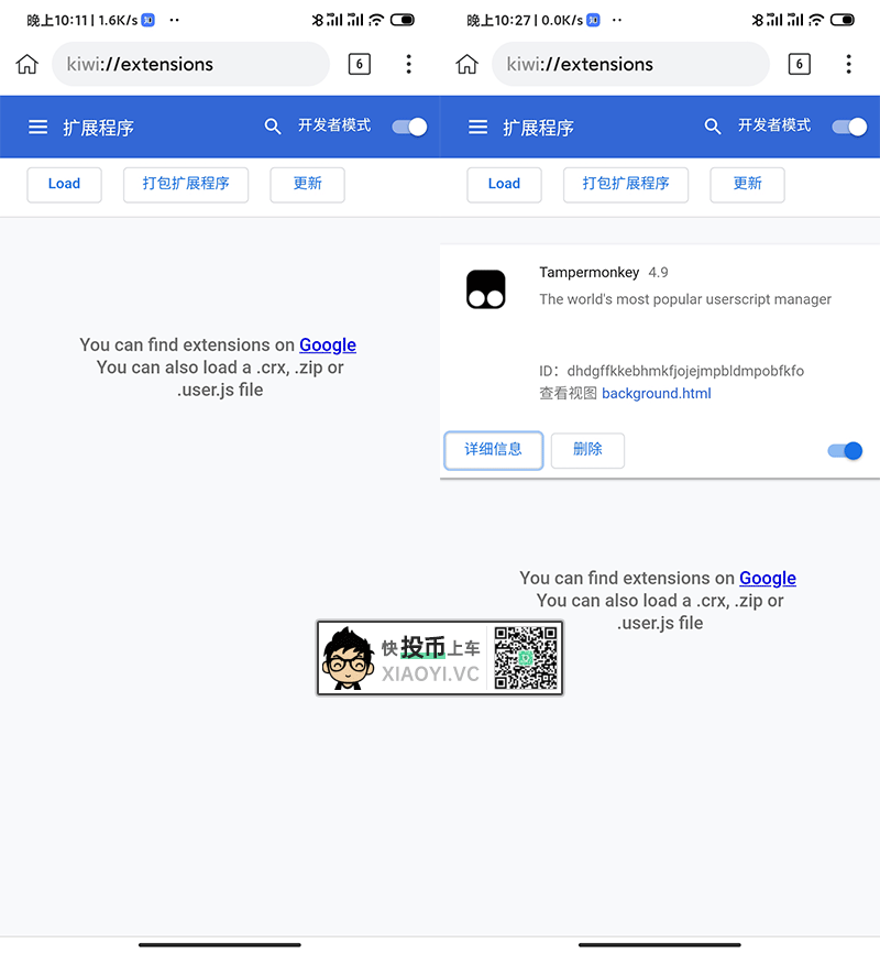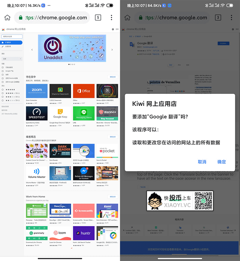「Kiwi」是由知名网站XDA团队(神级论坛,很多第三方ROM、各种系统折腾都是来自这个论坛的大佬们)成员开发的手机浏览器,最大亮点就是可以把下载的.crx扩展安装文件,导入到「Kiwi」浏览器里面安装。