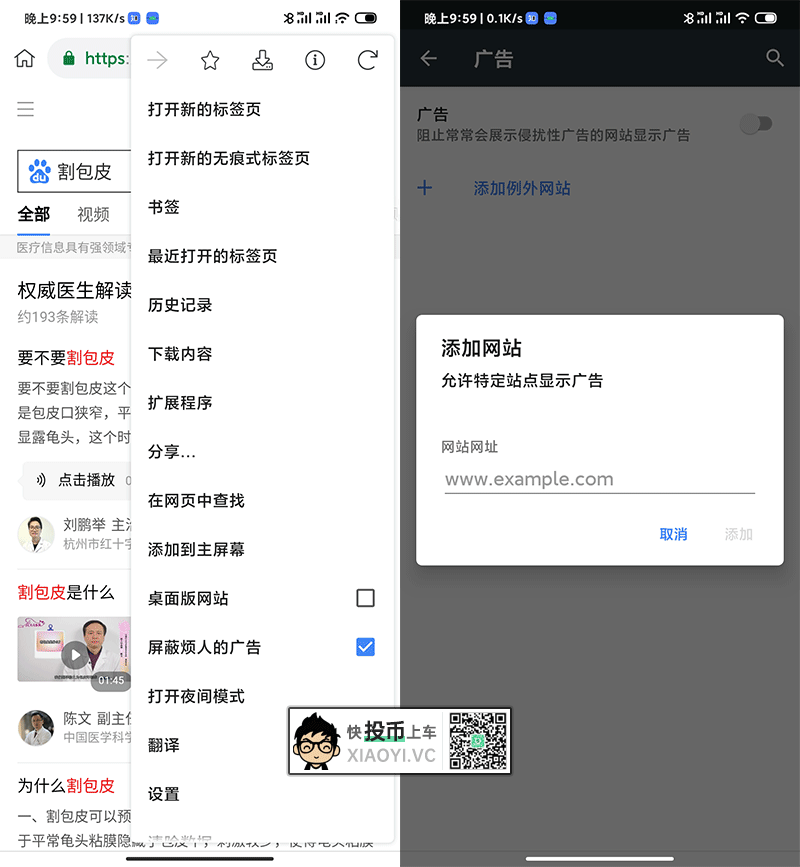 「Kiwi」自带了广告过滤功能,在菜单里面勾上”屏蔽烦人的广告”,希望对一些网站不屏蔽广告,也可在设置里面的广告”添加例外网站”。目前暂不支持订阅广告过滤规则,经测试大多数广告联盟的广告都可以过滤掉。