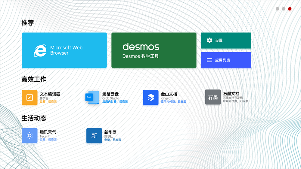 内置了浏览器以及一些应用,应用好像调用的是 PWA 网站,不过使用起来好像有点问题,提示证书问题,需要破除对 WebBrowser 的限制后才能正常使用。