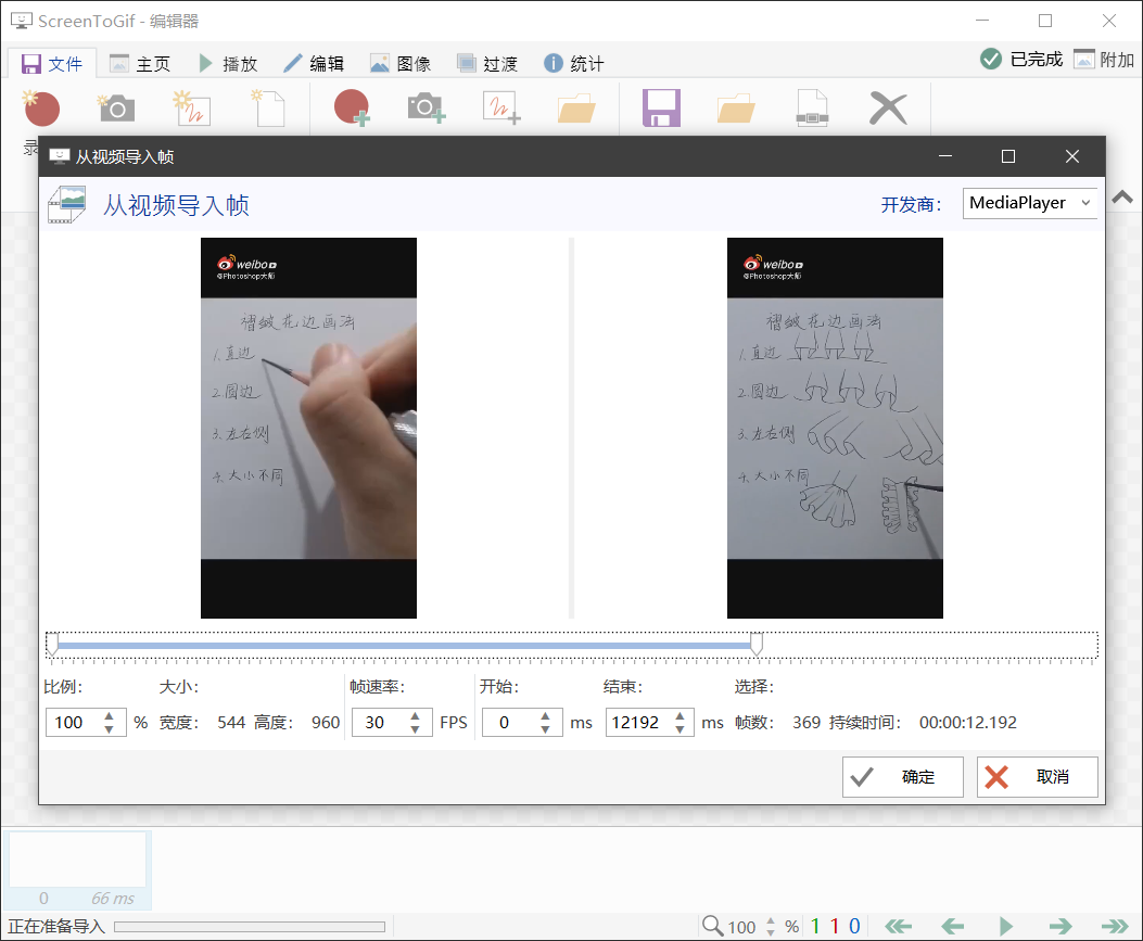 视频文件也可以直接拖放到「ScreenToGif」里面进行编辑,可以自由选择要导入的帧。
