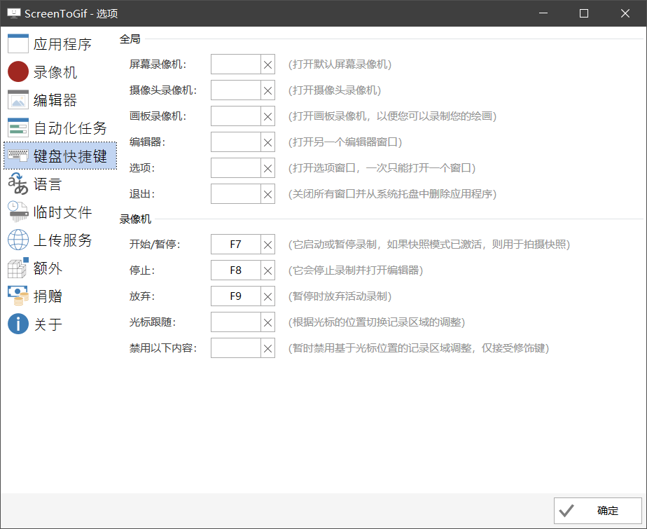 快捷键方面,默认是 F7 录制/暂停、F8 停止、F9 放弃录制,你也可以在设置里面设置其它快捷键。