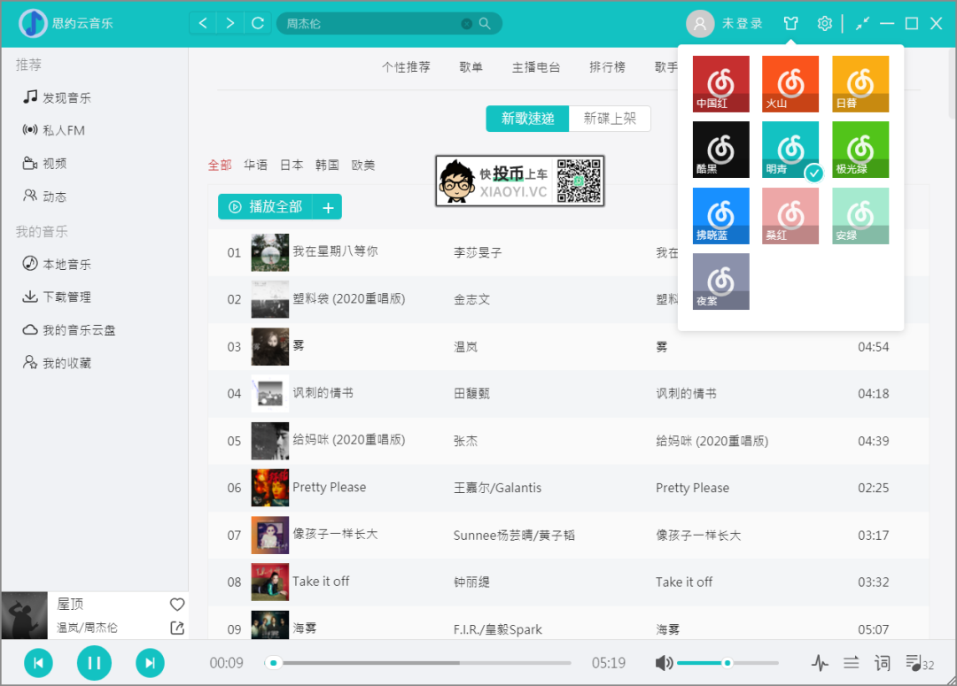 其它功能方面「思约云音乐」支持换主题颜色、自定义歌曲下载路径、桌面迷你模式、桌面歌词。