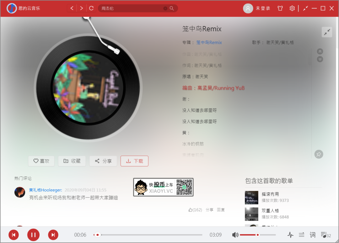 在音乐播放界面支持歌词、评论、喜欢、收藏、分享,以及下载,需要注意的是,如果付费或有版权的歌曲同样是没办法下载的。