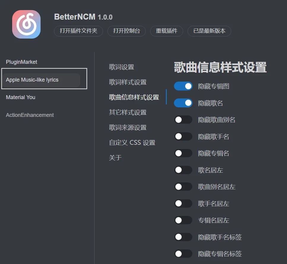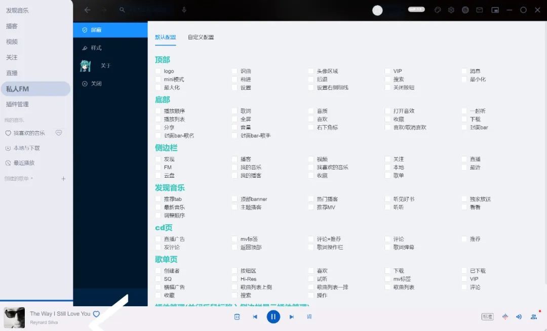 另外一个MikuPlugin也可以用来优化界面,可以与上面的TinyNCM组合使用,其中一个没有的地方再去看看另一个有没有,MikuPlugin没有不显示按钮的功能,只能直接关闭,但是可以进行自定义配置。