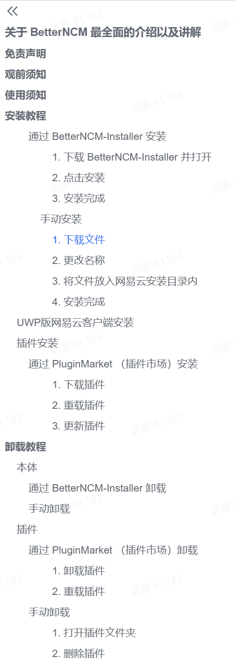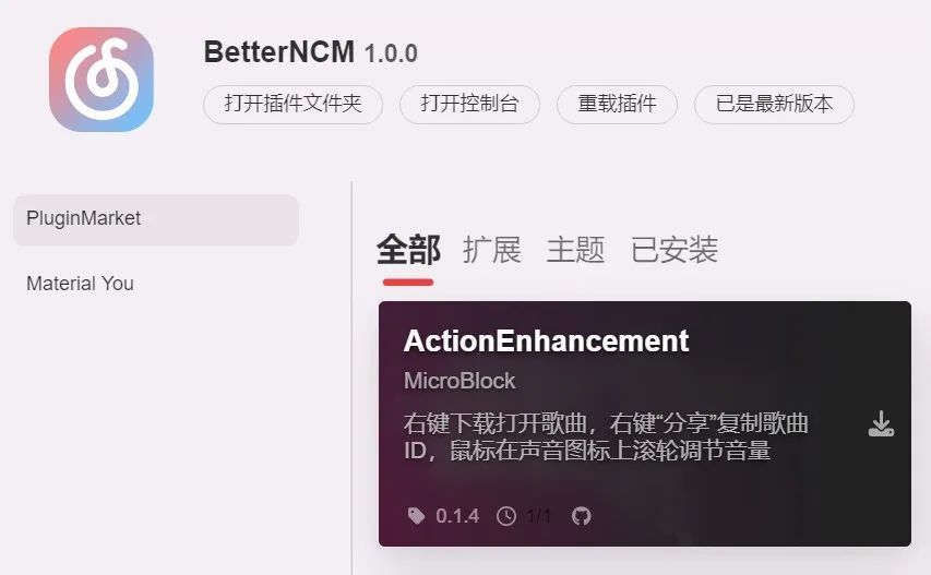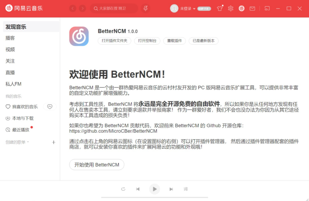 软件的具体信息,还可以在官方给出的一个使用文档查看,文档自称是网友创作的最好文档!看了一圈下来,这个确实是目前BetterNCM软件能找到的最详细文档,23年的1月28号还在持续更新,里面有使用方法、插件推荐、以及故障处理等等,值得一看!