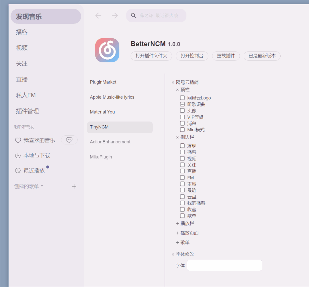 在关于界面优化的插件里,有两个比较实用的插件大家可以尝试一下-TinyNCM和MikuPlugin。