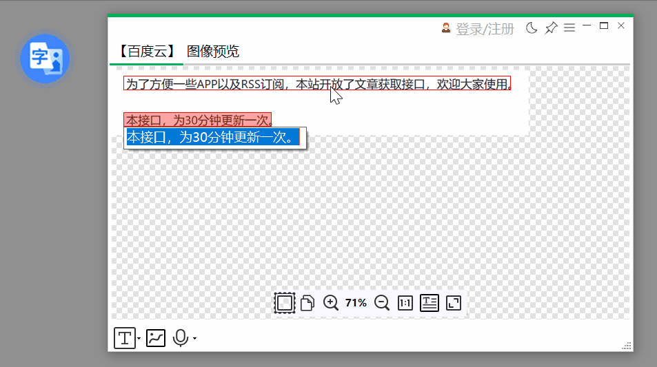 使用OCR识别之后,会弹出来一个图文模式的界面,你可以在这里按照图片中的文件区域来选择需要的文本,适合比较复杂的界面,避免多次截图,可以切换成文本模式,软件会自己保存识别结果。
