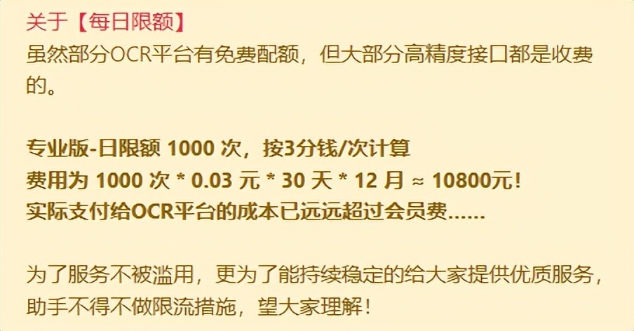 但是大家也可以体验一下再做决定,在软件的关于界面里面,作者也提到了软件识别接口调用的费用问题。