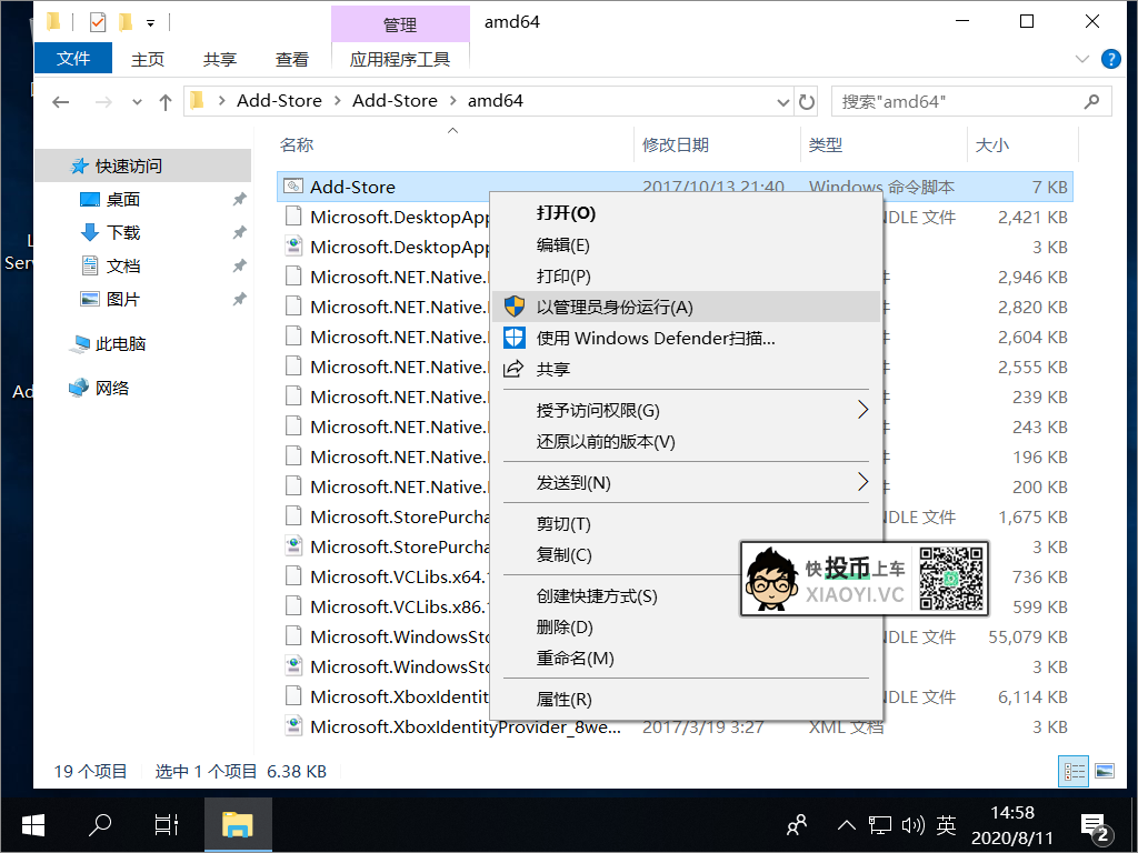 1.把下载的 “Add-Store.zip” 压缩包解压,打开 Add-Store\amd64 目录,右键以管理员身份运行 Add-Store 文件。