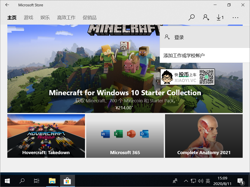 3.正常情况下就可以运行应用商店了,点击右上角的…图标,登陆你的微软账号就可以开始下载应用了。