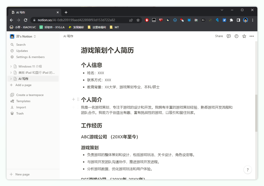 当你有创作瓶颈,或者没有写作思路的时候「Notion AI」可以帮你生成任何类型的内容,例如:你可以用它来帮你生成一份个人简历。