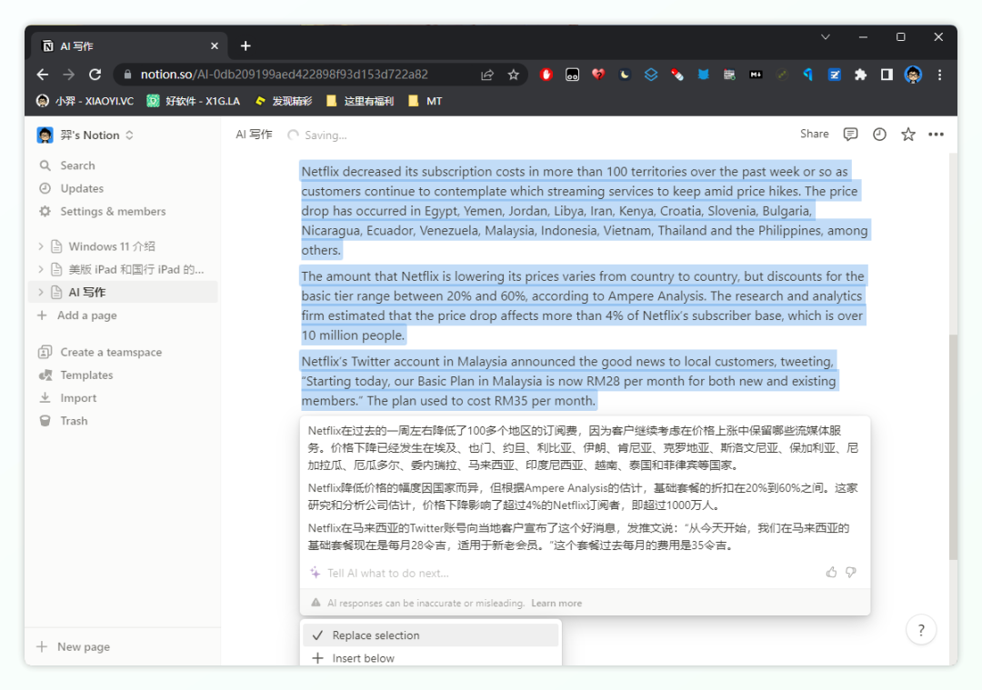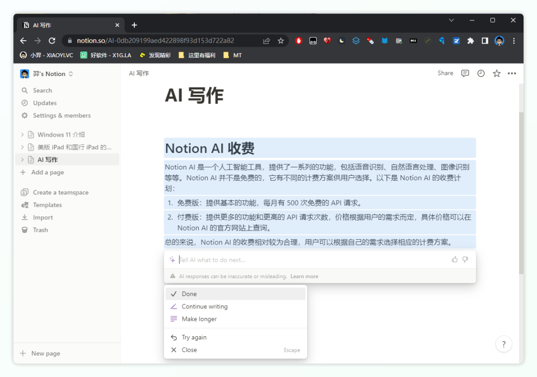在去年 11 月中旬这家公司内测了「Notion AI」采用 AI 写作的功能,可以根据你的提问需求帮你撰写、帮你编辑内容等等。现在全面开放了,无需申请。