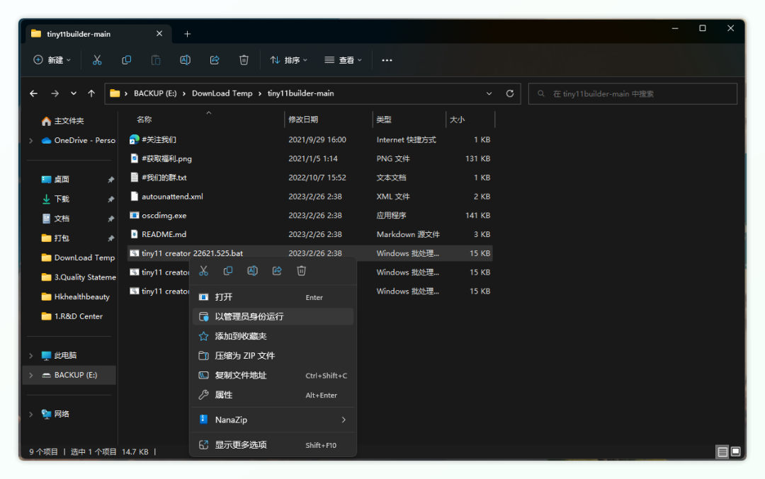 5.右键用管理员身份运行「Tiny11Builder」批处理命令脚本,注意的是需要运行对于版本的批处理: