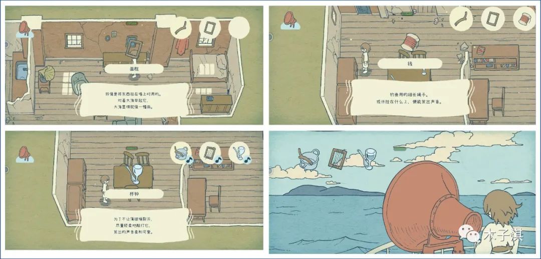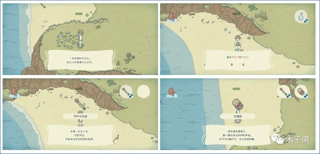 玩家需要移动并寻找道具,每个道具会有独特的音色,找到道具之后,在界面右上角选择要存放的槽位;如果槽位上已有道具,将会进行替换或者组合,组合道具物品可以合成为一个新的乐器,需要找到相同的旋律和声音。
