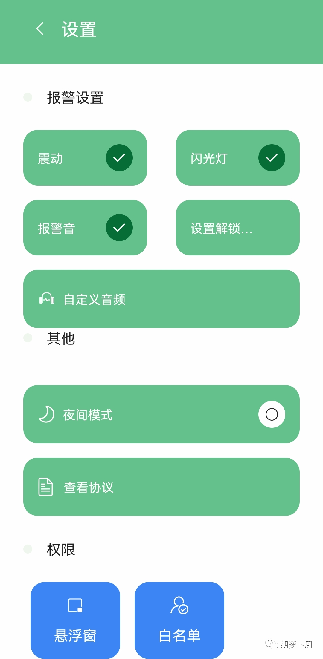 APP 报警设置支持震动、闪光灯、报警声、以及自定义音频,如需解锁,需要正确输入解锁密码,解锁密码可以提前设置。