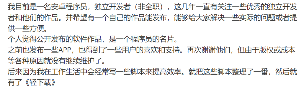 软件作者说他是一位独立安卓开发者,因为自己也有相关的下载需求,所以把常用的脚本打包组合成了这个App,让大家提高操作效率。