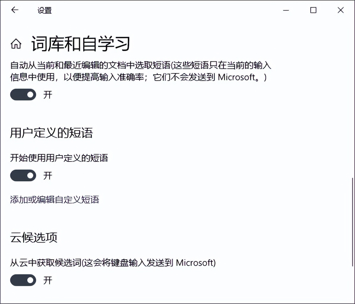 4.打开Win10微软拼音设置,进入词库和自学习,找到「添加或编辑自定义短语」