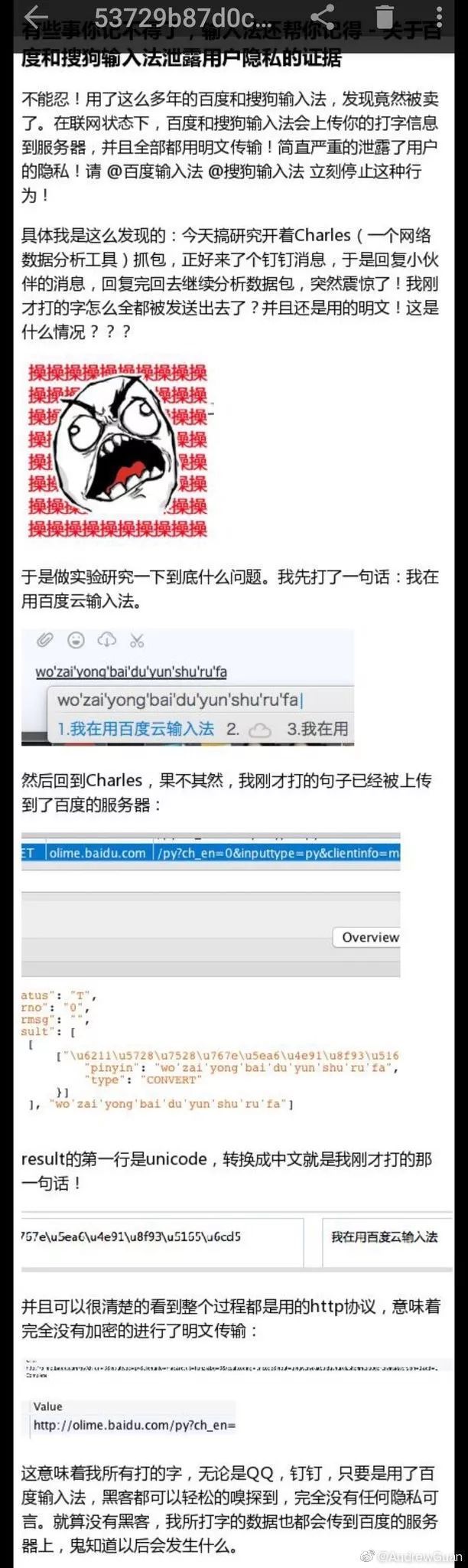 尤其是当今大数据的时代,有网友表示:输入法输入了篮球,第二天淘宝就给我推送篮球的优惠了。还有网友抓包分析了一波输入法: