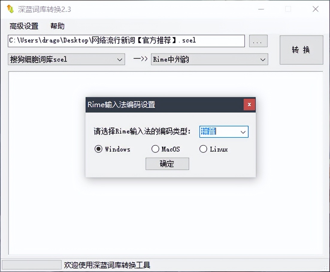 2.「深蓝词库转换」左边选择:搜狗细胞词库scel,右边选择:Rime中州韵,然后选择编码类型,点转换,选择词库保存目录。